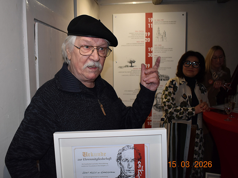 Der Otto-Knöpfer-Freundeskreis weist darauf hin, dass die Bilder Zimmermanns auch weiterhin zu besichtigen sind – nach telefonischer Vereinbarung (Tel.-Nr. 03628 615540) bis zum 15. März 26 in der Arnstädter Straße 32. Am 13. März gedenkt der Freundeskreis, der 2026 sein 20-jähriges Bestehen feiert, des 115. Geburtstags von Otto Knöpfer.