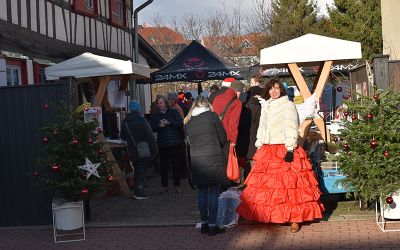 Ein strahlender Weihnachtsengel begrüßte am Knöpfer-Haus die Gäste zu den „Offenen Höfen im Advent“ in Holzhausen. In ihrem weit leuchtenden Kostüm begleitete Franziska Rosenbaum sie in den festlich geschmückten Hof und in die Ausstellungsräume. Der Erfurter Druckkünstler Ernst August Zimmermann stellte seine eindrucksvollen Bilder und die originale Arbeitsweise vor.