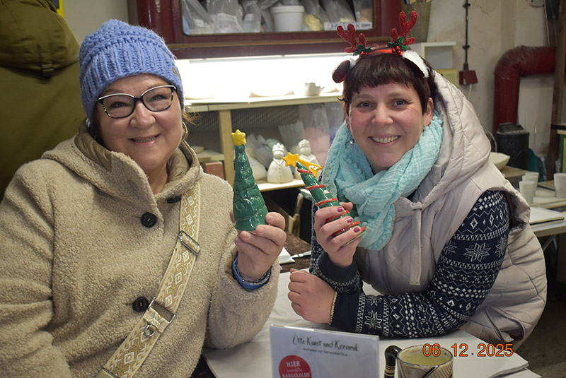 Knöpfer-Freundin Rebecca Otto (rechts, hier mit Christina Glass) hatte ihre Keramik-Werkstatt zu den Adventshöfen geöffnet