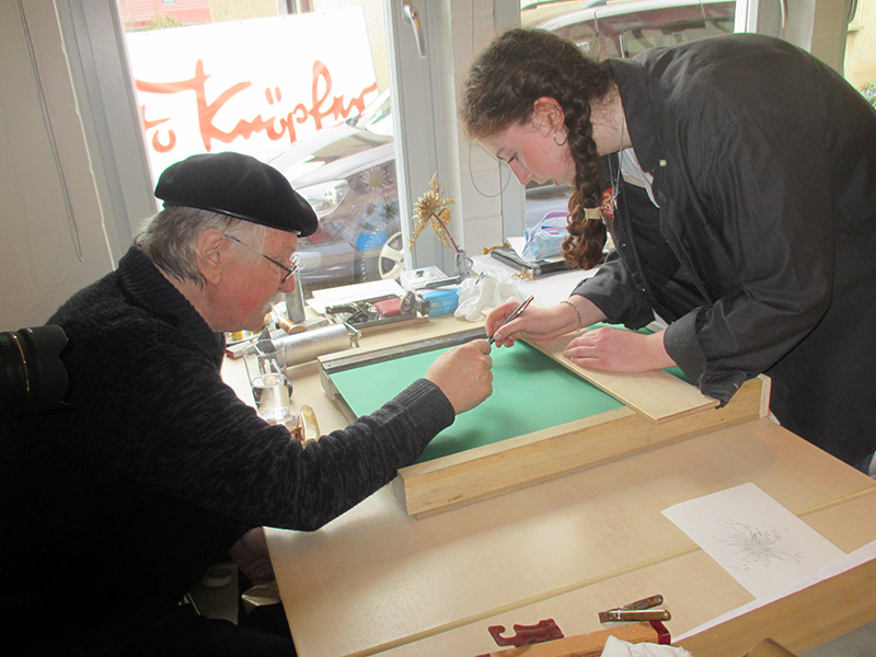 Zur Finissage seiner Ausstellung „Natur&Druck“, die an diesem Tag der internationalen Druckkunst endete, zeigte er sein künstlerisches Können nochmals vor Ort. Im Ausstellungsraum hatte er eine kleine Druckwerkstatt aufgebaut. Gemeinsam mit Schülern der Kunst-AG „Auf den Spuren Otto Knöpfers“ vom Melissantes-Gymnasium Arnstadt druckte er von einem farbigen Steindruck Silberdisteln, eines der bekanntesten Knöpfer-Motive, als Hommage an dessen 115. Geburtstag.